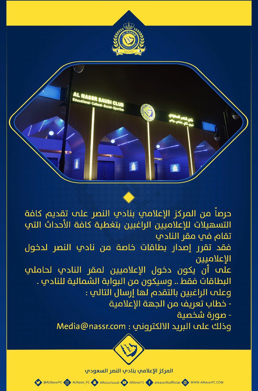 نادي النصر السعودي Sur Twitter حرصا من المركز الإعلامي بنادي النصر على تقديم كافة التسهيلات للإعلاميين المركز يصدر بطاقات خاصة لدخول مقر النادي Https T Co B6uejkddpc