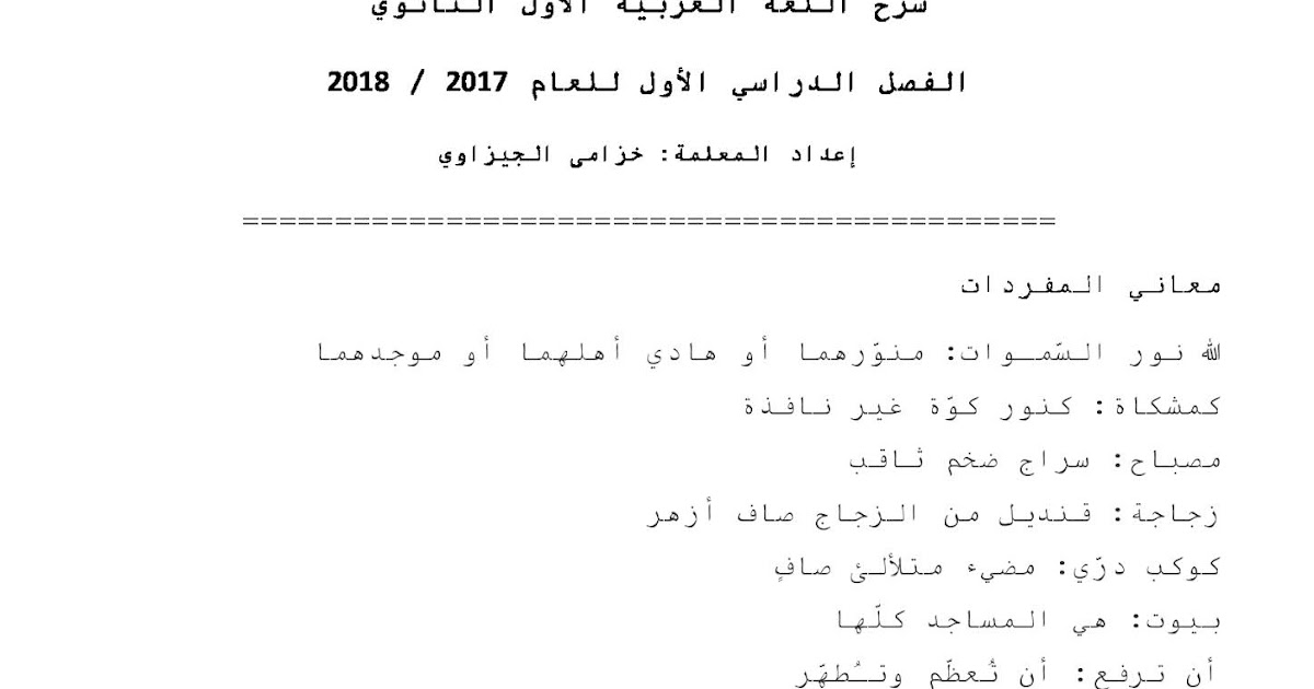 شرح سورة النور لمبحث اللغة العربية للصف الأول الثانوي فصل أول منتديات صقر الجنوب